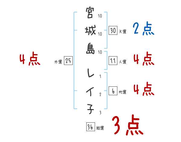 総運![]() | 宮城島レイ子さんの総運は36画の3つ星!先見性が豊かです。多少神経質で苦労することも。 あなたの人生を表す1番重要な運勢です。生涯を通じて影響する総合運となり、主に50歳以降の晩年期に影響を及ぼします。 |