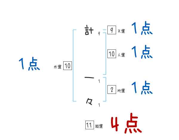 天運![]() | 計一々さんの天運は9画の1つ星!消極的で才能を発揮することが苦手なことも。周りの意見に耳を傾けましょう。 家系が持つ宿命的な運勢を表します。祖先から受け継いだ苗字ですので自分の力が及びません。家柄を象徴します。 |
