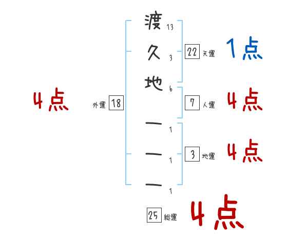 天運![]() | 渡久地一一一さんの天運は22画の1つ星!努力することが苦手ないっぽう手先が器用。芸術性にも優れる。 家系が持つ宿命的な運勢を表します。祖先から受け継いだ苗字ですので自分の力が及びません。家柄を象徴します。 |