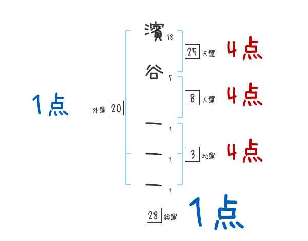 天運![]() | 濱谷一一一さんの天運は25画の4つ星!個性があり才能があふれる。強運の持ち主で発展する。 家系が持つ宿命的な運勢を表します。祖先から受け継いだ苗字ですので自分の力が及びません。家柄を象徴します。 |