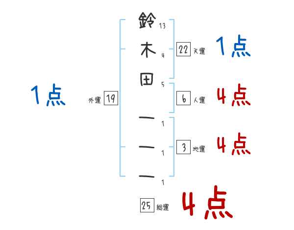 人運![]() | 鈴木田一一一さんの人運は6画の4つ星!慎重な努力家で信頼を得る。誠実な精神で向上心に優れる。 性格や才能などを表す2番目に重要な運勢です。人間関係や協調性、社会的な成功に影響します。主に20歳から50歳ぐらいまでの中年期の運勢を表します。 |