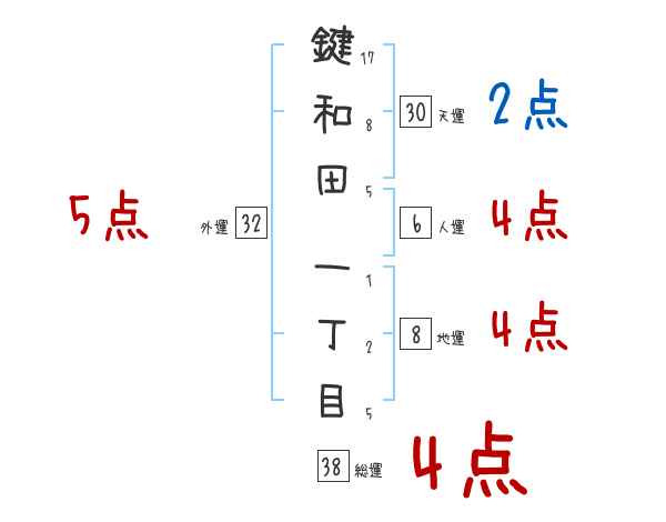 外運![]() | 鍵和田一丁目さんの外運は32画の5つ星!柔軟性があり成功する。チャンスが多く金運が良い。 生活面を象徴する運勢です。外部から受ける影響力を表し、結婚運、家庭運や職場、環境への順応性を表します。 |