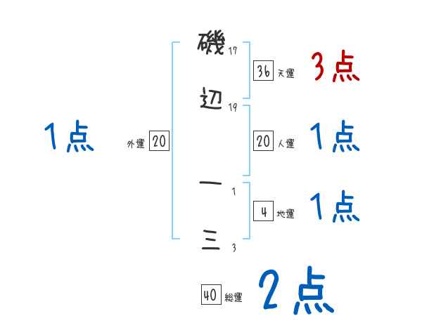 天運![]() | 磯辺一三さんの天運は36画の3つ星!先見性が豊かです。多少神経質で苦労することも。 家系が持つ宿命的な運勢を表します。祖先から受け継いだ苗字ですので自分の力が及びません。家柄を象徴します。 |