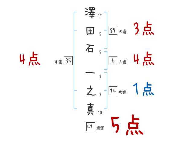 外運![]() | 澤田石一之真さんの外運は35画の4つ星!温厚な性格で感受性が高い。穏和な性格で人望が厚い。 生活面を象徴する運勢です。外部から受ける影響力を表し、結婚運、家庭運や職場、環境への順応性を表します。 |