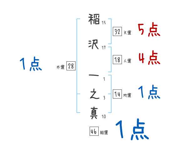 天運![]() | 稲沢一之真さんの天運は32画の5つ星!柔軟性があり成功する。チャンスが多く金運が良い。 家系が持つ宿命的な運勢を表します。祖先から受け継いだ苗字ですので自分の力が及びません。家柄を象徴します。 |