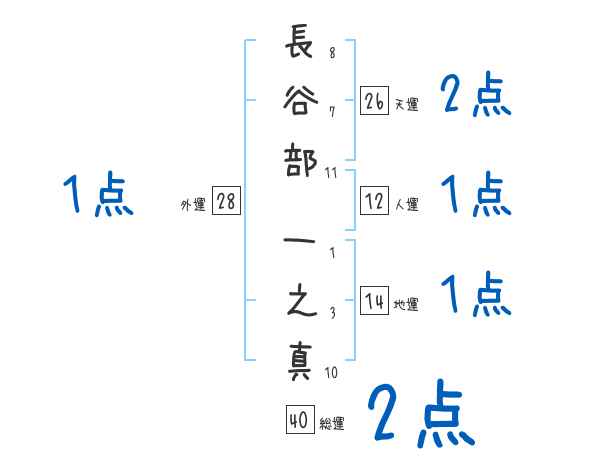 天運![]() | 長谷部一之真さんの天運は26画の2つ星!波瀾万丈かも。信頼できる人を大事にしましょう。 家系が持つ宿命的な運勢を表します。祖先から受け継いだ苗字ですので自分の力が及びません。家柄を象徴します。 |
