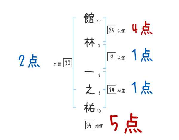 総運![]() | 館林一之祐さんの総運は39画の5つ星!社交性に優れ人望が厚い。人の上に立ち成功する。 あなたの人生を表す1番重要な運勢です。生涯を通じて影響する総合運となり、主に50歳以降の晩年期に影響を及ぼします。 |