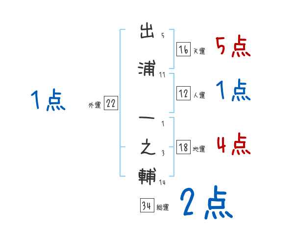 外運![]() | 出浦一之輔さんの外運は22画の1つ星!努力することが苦手ないっぽう手先が器用。芸術性にも優れる。 生活面を象徴する運勢です。外部から受ける影響力を表し、結婚運、家庭運や職場、環境への順応性を表します。 |