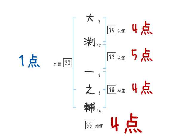 総運![]() | 大渕一之輔さんの総運は33画の4つ星!権力志向でプライドが高い。勇気があり運を切り開き成功する。 あなたの人生を表す1番重要な運勢です。生涯を通じて影響する総合運となり、主に50歳以降の晩年期に影響を及ぼします。 |
