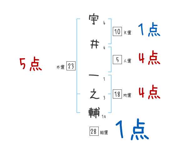 総運![]() | 宇井一之輔さんの総運は28画の1つ星!家庭環境に注意。スポーツで活躍できる能力があるかも。 あなたの人生を表す1番重要な運勢です。生涯を通じて影響する総合運となり、主に50歳以降の晩年期に影響を及ぼします。 |