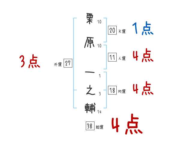 外運![]() | 栗原一之輔さんの外運は27画の3つ星!頭脳明晰だが強情で摩擦が多い傾向。孤立に注意。 生活面を象徴する運勢です。外部から受ける影響力を表し、結婚運、家庭運や職場、環境への順応性を表します。 |