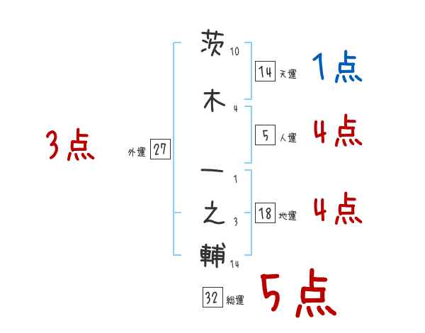 総運![]() | 茨木一之輔さんの総運は32画の5つ星!柔軟性があり成功する。チャンスが多く金運が良い。 あなたの人生を表す1番重要な運勢です。生涯を通じて影響する総合運となり、主に50歳以降の晩年期に影響を及ぼします。 |