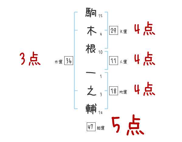 総運![]() | 駒木根一之輔さんの総運は47画の5つ星!実力が開花し発展する円満な人生。財に恵まれる。 あなたの人生を表す1番重要な運勢です。生涯を通じて影響する総合運となり、主に50歳以降の晩年期に影響を及ぼします。 |
