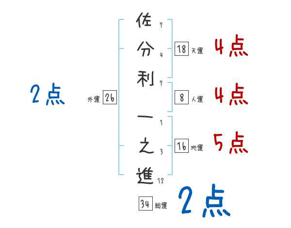 天運![]() | 佐分利一之進さんの天運は18画の4つ星!情熱的で剛気。忍耐力があり信頼される。 家系が持つ宿命的な運勢を表します。祖先から受け継いだ苗字ですので自分の力が及びません。家柄を象徴します。 |