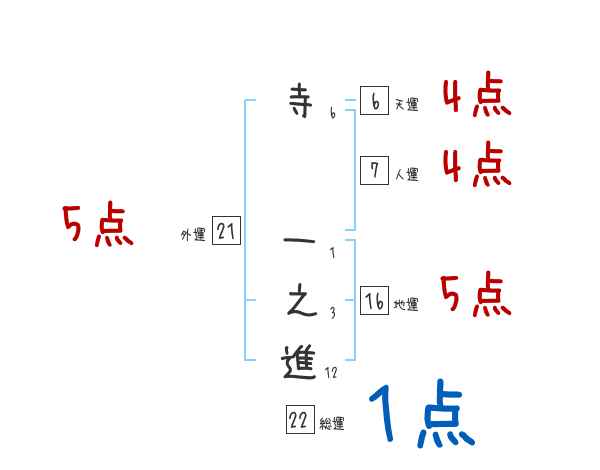 外運![]() | 寺一之進さんの外運は21画の5つ星!統率力がある。独立し成功する。名誉を手に入れる。 生活面を象徴する運勢です。外部から受ける影響力を表し、結婚運、家庭運や職場、環境への順応性を表します。 |