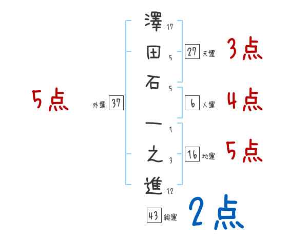 外運![]() | 澤田石一之進さんの外運は37画の5つ星!努力家で順応性に優れる。現実的な考え方ができ忠実に物事をこなす。 生活面を象徴する運勢です。外部から受ける影響力を表し、結婚運、家庭運や職場、環境への順応性を表します。 |