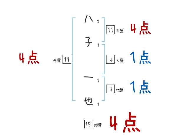 天運![]() | 八子一也さんの天運は11画の4つ星!着実に富や地位を得る幸運な人生。 家系が持つ宿命的な運勢を表します。祖先から受け継いだ苗字ですので自分の力が及びません。家柄を象徴します。 |