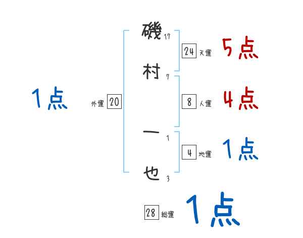 総運![]() | 磯村一也さんの総運は28画の1つ星!家庭環境に注意。スポーツで活躍できる能力があるかも。 あなたの人生を表す1番重要な運勢です。生涯を通じて影響する総合運となり、主に50歳以降の晩年期に影響を及ぼします。 |