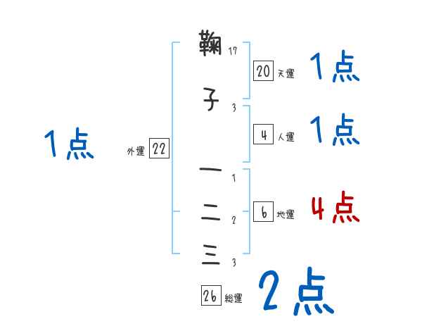 総運![]() | 鞠子一二三さんの総運は26画の2つ星!波瀾万丈かも。信頼できる人を大事にしましょう。 あなたの人生を表す1番重要な運勢です。生涯を通じて影響する総合運となり、主に50歳以降の晩年期に影響を及ぼします。 |