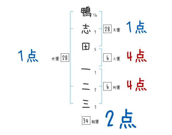 天運![]() | 鴨志田一二三さんの天運は28画の1つ星!家庭環境に注意。スポーツで活躍できる能力があるかも。 家系が持つ宿命的な運勢を表します。祖先から受け継いだ苗字ですので自分の力が及びません。家柄を象徴します。 |