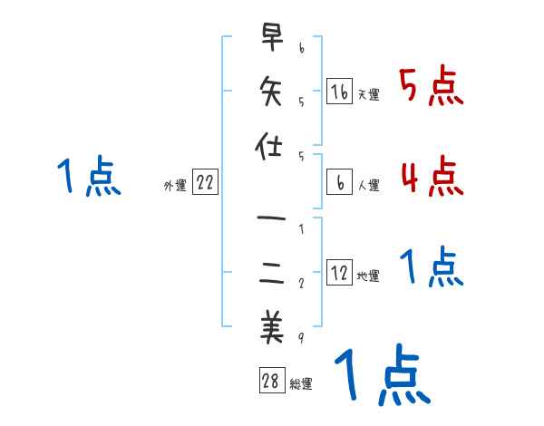 天運![]() | 早矢仕一二美さんの天運は16画の5つ星!人望が厚く大きく発展する。逆転成功が見える。 家系が持つ宿命的な運勢を表します。祖先から受け継いだ苗字ですので自分の力が及びません。家柄を象徴します。 |