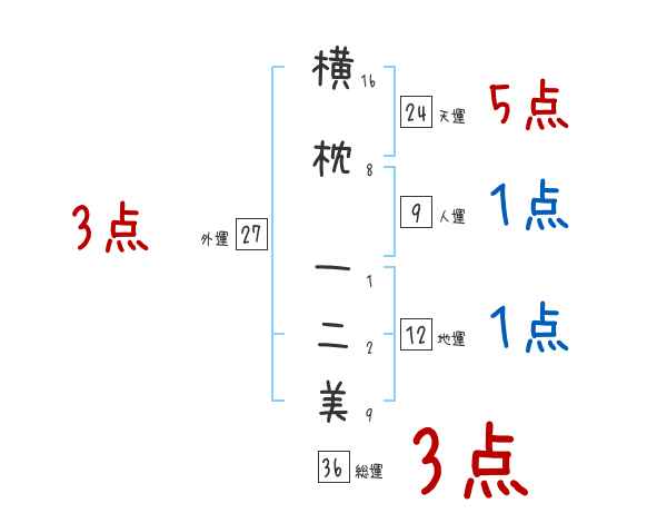 総運![]() | 横枕一二美さんの総運は36画の3つ星!先見性が豊かです。多少神経質で苦労することも。 あなたの人生を表す1番重要な運勢です。生涯を通じて影響する総合運となり、主に50歳以降の晩年期に影響を及ぼします。 |