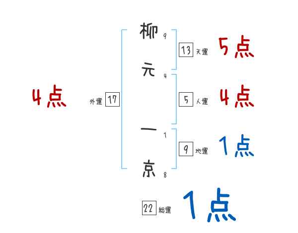 総運![]() | 柳元一京さんの総運は22画の1つ星!努力することが苦手ないっぽう手先が器用。芸術性にも優れる。 あなたの人生を表す1番重要な運勢です。生涯を通じて影響する総合運となり、主に50歳以降の晩年期に影響を及ぼします。 |