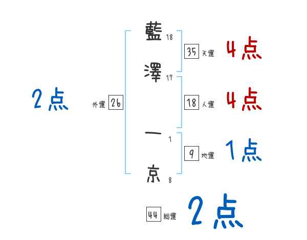総運![]() | 藍澤一京さんの総運は44画の2つ星!誠実で慎重な性格。物事を考えすぎないように注意しましょう。 あなたの人生を表す1番重要な運勢です。生涯を通じて影響する総合運となり、主に50歳以降の晩年期に影響を及ぼします。 |