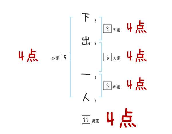 外運![]() | 下出一人さんの外運は5画の4つ星!健康で安泰。協調性に優れ、財産に恵まれる。 生活面を象徴する運勢です。外部から受ける影響力を表し、結婚運、家庭運や職場、環境への順応性を表します。 |