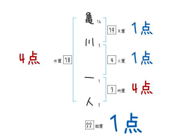 天運![]() | 亀川一人さんの天運は19画の1つ星!優れた才能を持ちますが、協調性が足りないことも。周りの人と協力する事を意識しましょう。 家系が持つ宿命的な運勢を表します。祖先から受け継いだ苗字ですので自分の力が及びません。家柄を象徴します。 |
