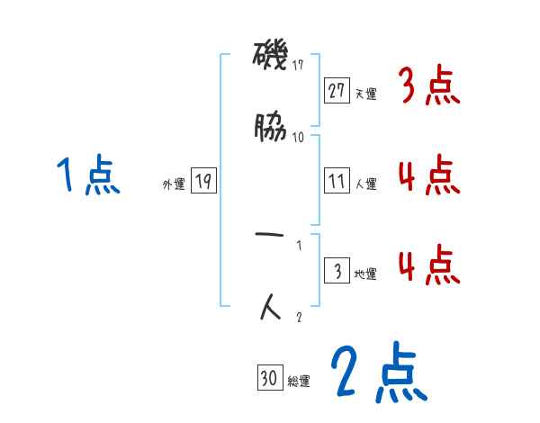 天運![]() | 磯脇一人さんの天運は27画の3つ星!頭脳明晰だが強情で摩擦が多い傾向。孤立に注意。 家系が持つ宿命的な運勢を表します。祖先から受け継いだ苗字ですので自分の力が及びません。家柄を象徴します。 |