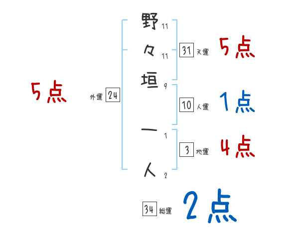 人運![]() | 野々垣一人さんの人運は10画の1つ星!不安を感じやすい傾向。ストレスを抱えないように注意しましょう。 性格や才能などを表す2番目に重要な運勢です。人間関係や協調性、社会的な成功に影響します。主に20歳から50歳ぐらいまでの中年期の運勢を表します。 |