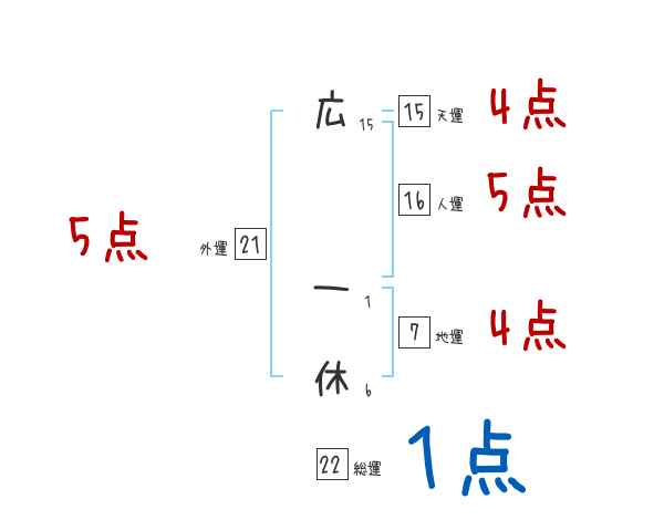 外運![]() | 広一休さんの外運は21画の5つ星!統率力がある。独立し成功する。名誉を手に入れる。 生活面を象徴する運勢です。外部から受ける影響力を表し、結婚運、家庭運や職場、環境への順応性を表します。 |