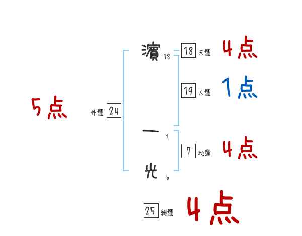 外運![]() | 濵一光さんの外運は24画の5つ星!家庭運が良く順調な人生。金運にも恵まれる。 生活面を象徴する運勢です。外部から受ける影響力を表し、結婚運、家庭運や職場、環境への順応性を表します。 |