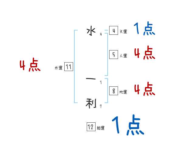天運![]() | 水一利さんの天運は4画の1つ星!感情が不安定で苦労するかも。周囲との協調を心掛けましょう。 家系が持つ宿命的な運勢を表します。祖先から受け継いだ苗字ですので自分の力が及びません。家柄を象徴します。 |