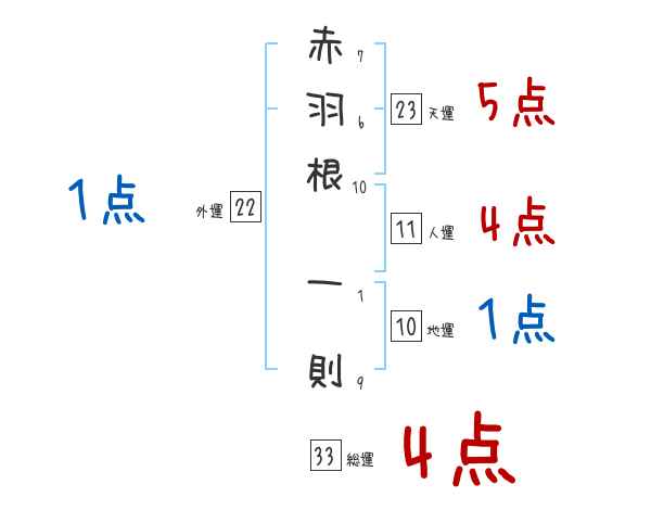 天運![]() | 赤羽根一則さんの天運は23画の5つ星!想像力に優れ活力がある。一代で成功し名誉を手に入れる。 家系が持つ宿命的な運勢を表します。祖先から受け継いだ苗字ですので自分の力が及びません。家柄を象徴します。 |