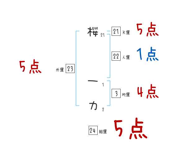 天運![]() | 桜一力さんの天運は21画の5つ星!統率力がある。独立し成功する。名誉を手に入れる。 家系が持つ宿命的な運勢を表します。祖先から受け継いだ苗字ですので自分の力が及びません。家柄を象徴します。 |