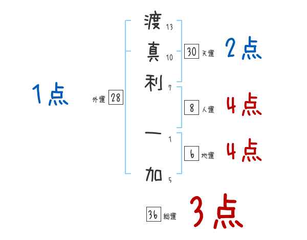 渡真利一加さんの画数の鑑定結果