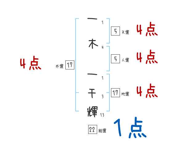 外運![]() | 一木一千輝さんの外運は17画の4つ星!積極的な行動力。地位を気づき財産を手に入れる。純粋な心と直感力。 生活面を象徴する運勢です。外部から受ける影響力を表し、結婚運、家庭運や職場、環境への順応性を表します。 |