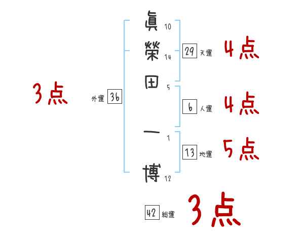 外運![]() | 眞榮田一博さんの外運は36画の3つ星!先見性が豊かです。多少神経質で苦労することも。 生活面を象徴する運勢です。外部から受ける影響力を表し、結婚運、家庭運や職場、環境への順応性を表します。 |