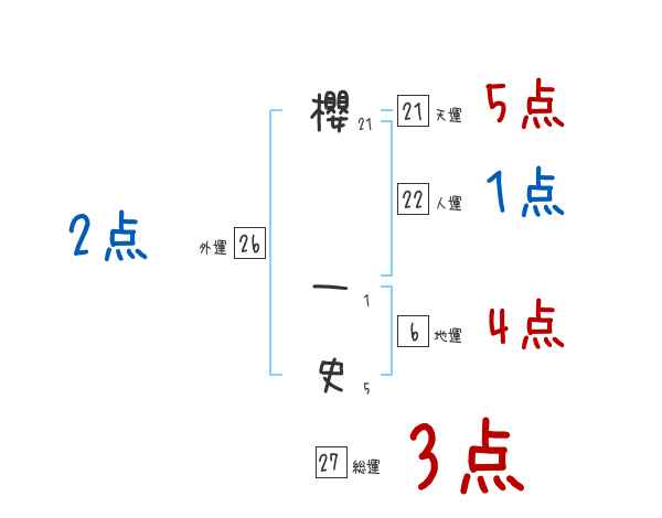 天運![]() | 櫻一史さんの天運は21画の5つ星!統率力がある。独立し成功する。名誉を手に入れる。 家系が持つ宿命的な運勢を表します。祖先から受け継いだ苗字ですので自分の力が及びません。家柄を象徴します。 |