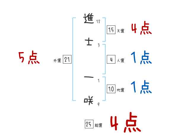 人運![]() | 進士一咲さんの人運は4画の1つ星!感情が不安定で苦労するかも。周囲との協調を心掛けましょう。 性格や才能などを表す2番目に重要な運勢です。人間関係や協調性、社会的な成功に影響します。主に20歳から50歳ぐらいまでの中年期の運勢を表します。 |