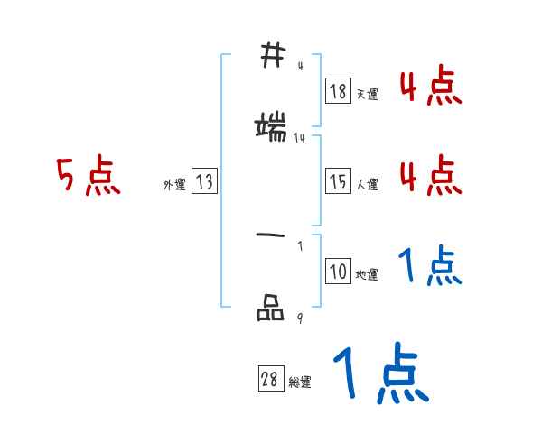 総運![]() | 井端一品さんの総運は28画の1つ星!家庭環境に注意。スポーツで活躍できる能力があるかも。 あなたの人生を表す1番重要な運勢です。生涯を通じて影響する総合運となり、主に50歳以降の晩年期に影響を及ぼします。 |
