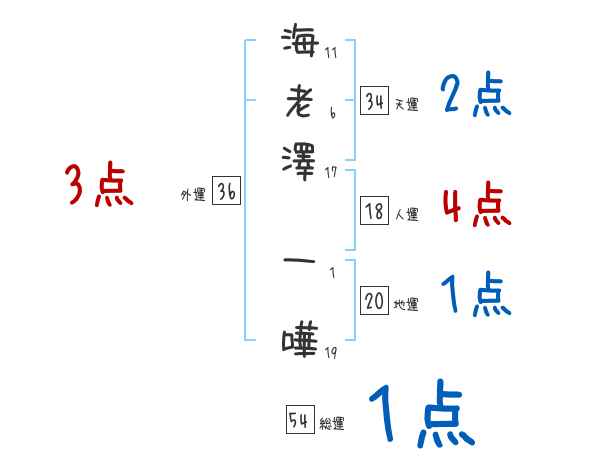 外運![]() | 海老澤一嘩さんの外運は36画の3つ星!先見性が豊かです。多少神経質で苦労することも。 生活面を象徴する運勢です。外部から受ける影響力を表し、結婚運、家庭運や職場、環境への順応性を表します。 |