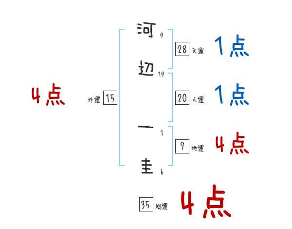 天運![]() | 河辺一圭さんの天運は28画の1つ星!家庭環境に注意。スポーツで活躍できる能力があるかも。 家系が持つ宿命的な運勢を表します。祖先から受け継いだ苗字ですので自分の力が及びません。家柄を象徴します。 |