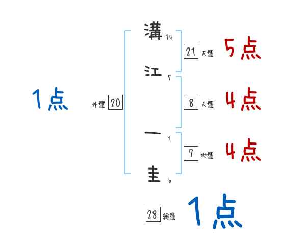 天運![]() | 溝江一圭さんの天運は21画の5つ星!統率力がある。独立し成功する。名誉を手に入れる。 家系が持つ宿命的な運勢を表します。祖先から受け継いだ苗字ですので自分の力が及びません。家柄を象徴します。 |
