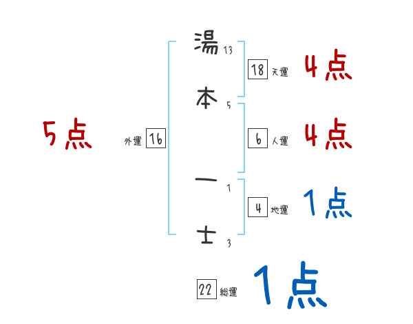 外運![]() | 湯本一士さんの外運は16画の5つ星!人望が厚く大きく発展する。逆転成功が見える。 生活面を象徴する運勢です。外部から受ける影響力を表し、結婚運、家庭運や職場、環境への順応性を表します。 |