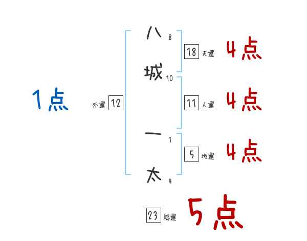 天運![]() | 八城一太さんの天運は18画の4つ星!情熱的で剛気。忍耐力があり信頼される。 家系が持つ宿命的な運勢を表します。祖先から受け継いだ苗字ですので自分の力が及びません。家柄を象徴します。 |