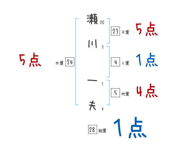 総運![]() | 瀬川一夫さんの総運は28画の1つ星!家庭環境に注意。スポーツで活躍できる能力があるかも。 あなたの人生を表す1番重要な運勢です。生涯を通じて影響する総合運となり、主に50歳以降の晩年期に影響を及ぼします。 |