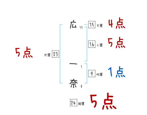 人運![]() | 広一奈さんの人運は16画の5つ星!人望が厚く大きく発展する。逆転成功が見える。 性格や才能などを表す2番目に重要な運勢です。人間関係や協調性、社会的な成功に影響します。主に20歳から50歳ぐらいまでの中年期の運勢を表します。 |